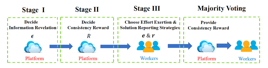 文章的主體思路如圖一所示。我們將眾包平臺和工人之間的交互建模成一個三階段的博弈。在第一階段,平臺設計信息發布機制并向工人公開細節;在第二階段,平臺設計眾包獎勵機制且將其公開;在第三階段,工人們決定是否投入足夠多的精力完成任務,并且決定是否真實上報數據。當工人們上報他們的數據后,平臺根據之前定好的獎勵機制向工人發放獎勵。