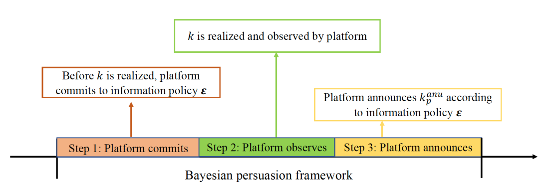 文章的重點在于和如何對策略性的信息發布進行建模和分析。我們采用了經濟學中的貝葉斯勸說(Bayesian Persuasion)理論,將信息發布建模成如圖二所示的框架。該框架有三個步驟。第一,平臺在非對稱信息出現之前決定一個發布機制,并且對其做出承諾;第二,非對稱信息出現并只對平臺可見;第三,平臺按照之前承諾的信息發布機制對信息進行處理并公布給工人。
