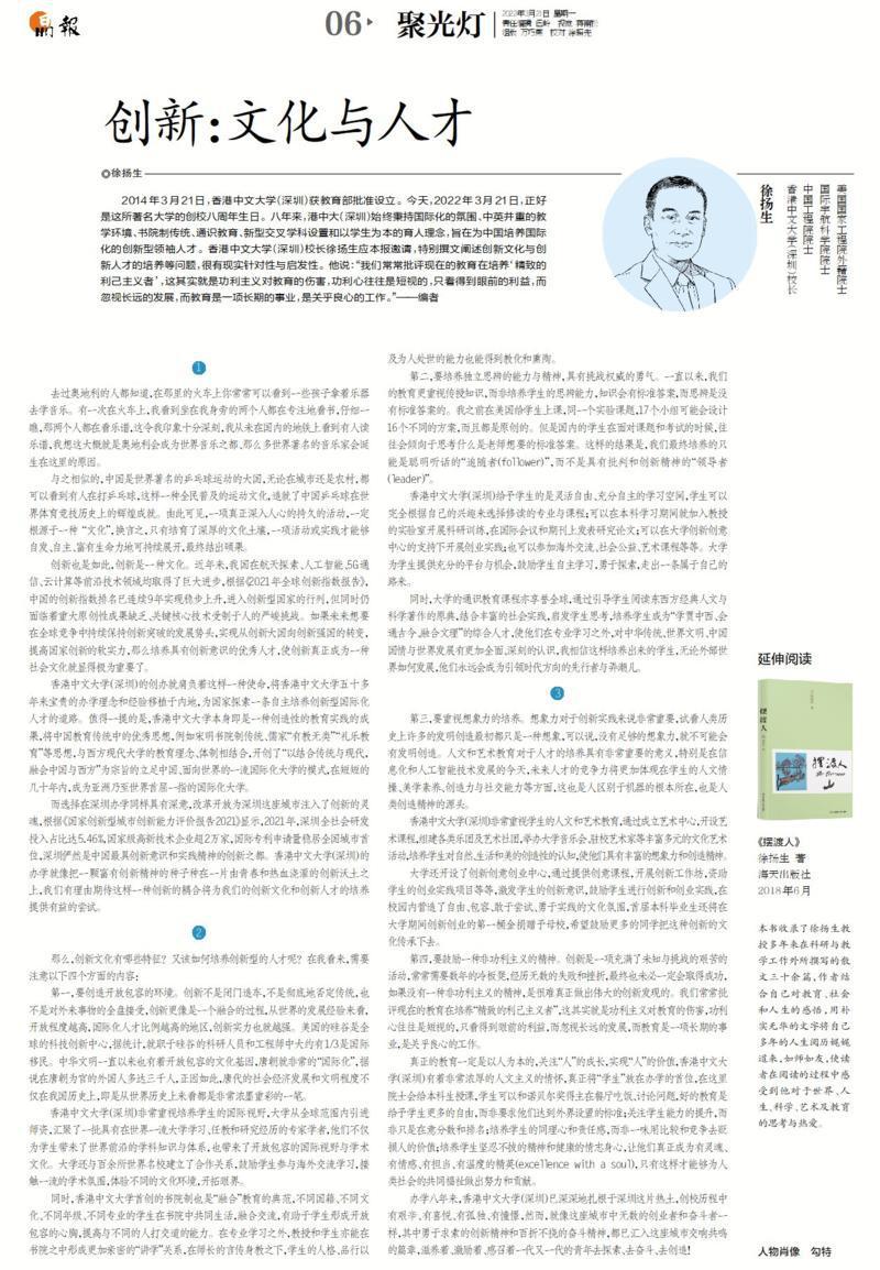 香港中文大學(深圳)八周歲 徐揚生校長撰文暢談創新與人才