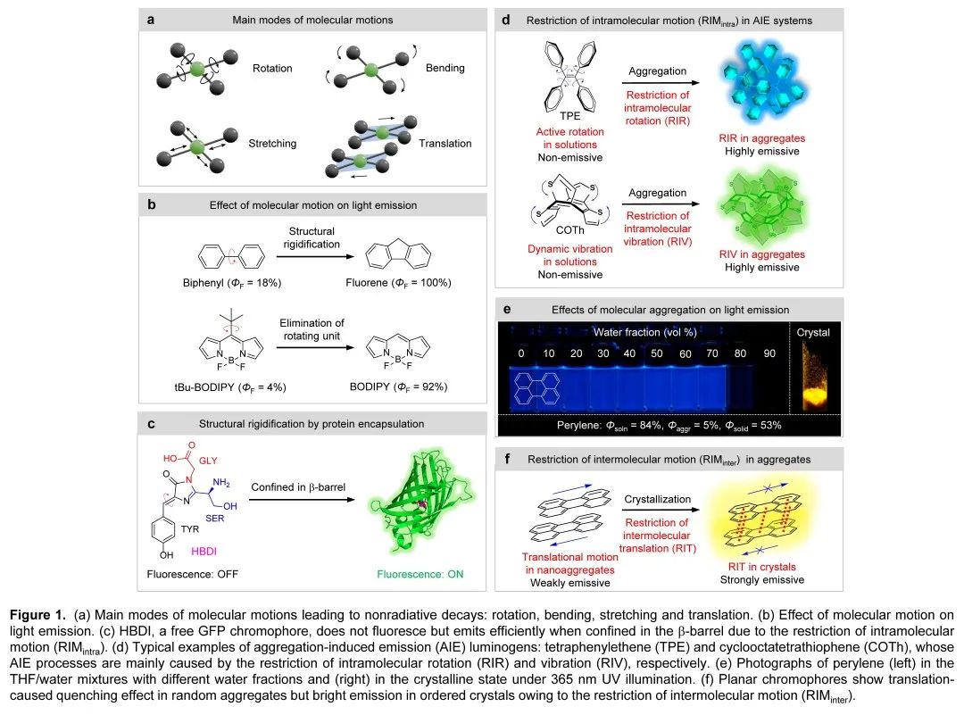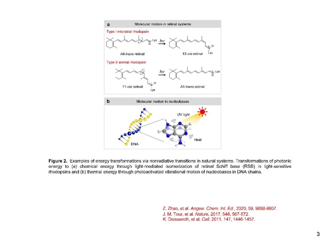 眾所周知,分子吸收特定波長的光后會進入激發態,由于處于高能激發態的分子不穩定,總會通過輻射躍遷或者非輻射躍遷的失活過程返回基態。對于輻射躍遷過程,電子的運動發揮了主導作用。而核的運動,也就是分子運動,在非輻射躍遷過程中扮演了重要角色。早在1939年, Gilbert N. Lewis (41次獲得諾貝爾獎提名的著名化學家)和Melvin Calvin (卡爾文循環的發現者,1961年諾貝爾獎獲得者)在一篇綜述文章中明確提及鹵素原子、硝基、苯環等取代基團的分子運動能促進非輻射躍遷過程 (loose bolt effect),進而猝滅熒光發射 (Chem. Rev., 1939, 25, 273-328)。但是,長久以來,人們往往是利用輻射躍遷過程開發高效發光材料,卻鮮有關注非輻射躍遷過程甚至調控分子運動以積極利用這個過程。事實上,在我們自然界中就有很多生動的例子表明非輻射躍遷過程的應用價值,比如視黃醛的分子異構化能夠將光能轉化為化學能進而參與眼睛的視覺感知,DNA堿基的分子運動可以通過極快的內轉換機制將光能轉化為熱能從而避免發生光化學反應進而保護遺傳信息的完整性。
