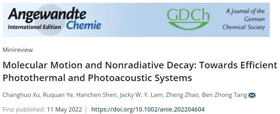 理工學院唐本忠院士和趙征教授在化學頂級期刊《Angewandte Chemie》發表題為“Molecular Motion and Nonradiative Decay: Towards Efficient Photothermal and Photoacoustic Systems”的文章,這是唐本忠院士團隊一個月內連續兩次在化學類頂刊上發表重要工作。