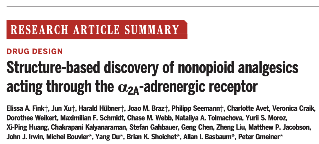香港中文大學(xué)(深圳)醫(yī)學(xué)院/科比爾卡創(chuàng)新藥物開發(fā)研究院杜洋教授,聯(lián)合埃爾朗根-紐倫堡大學(xué)Peter Gmeiner教授和美國加州大學(xué)舊金山分校Brian Shoichet教授團(tuán)隊等,共同通訊在國際一流科學(xué)期刊Science雜志(IF=63.71)發(fā)表了最新的研究成果:“Structure-based discovery of nonopioid analgesics acting through the α2A-adrenergic receptor”。斯坦福大學(xué)醫(yī)學(xué)院博士后/原科比爾卡研究院研究助理徐俊、加州大學(xué)舊金山分校博士生Elissa Fink、聯(lián)合埃爾朗根-紐倫堡大學(xué)博士Harald Hubner等并列第一作者。