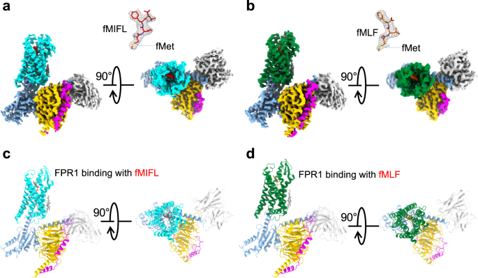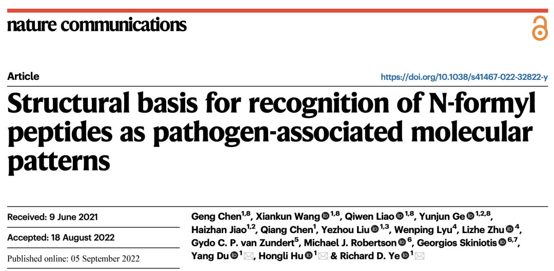 香港中文大學(xué)(深圳)醫(yī)學(xué)院、科比爾卡創(chuàng)新藥物開發(fā)研究院葉德全教授,聯(lián)合杜洋教授和胡紅麗教授在國際一流科技期刊Nature Communication雜志(IF=17.69)發(fā)表了最新的研究成果:“Structural basis for recognition of N-formyl peptides as pathogen-associated molecular patterns”。葉德全教授,杜洋教授和胡紅麗教授為共同通訊作者。杜洋教授團(tuán)隊陳耕博士為論文第一作者,王先坤、廖綺文、葛運(yùn)軍為論文共同第一作者。該研究通過冷凍電鏡技術(shù),分別解析了甲酰肽受體FPR1結(jié)合大腸桿菌甲酰三肽fMLF和金黃色葡萄球菌甲酰四肽fMIFL的結(jié)構(gòu),揭示了FPR1對N端甲酰基的具體識別機(jī)制,為今后以FPR1為靶點(diǎn)研發(fā)療效好副作用小的新型抗菌抗感染藥物提供結(jié)構(gòu)基礎(chǔ)。