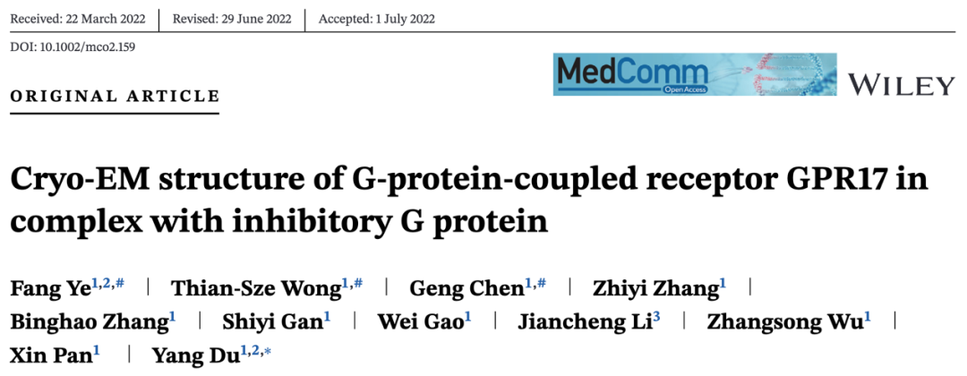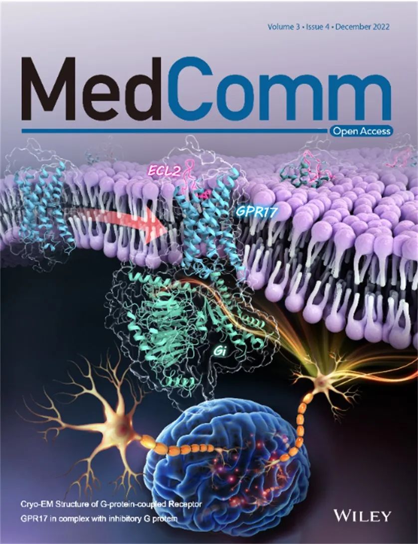 2022年9月10日,香港中文大學(xué)(深圳)醫(yī)學(xué)院杜洋教授團(tuán)隊在本土快速發(fā)展的主流期刊MedComm在線發(fā)表了最新的研究成果“Cryo-EM structure of G-protein-coupled receptor GPR17 in complex with inhibitory G protein”,并被選為封面文章重點(diǎn)報道。香港中文大學(xué)(深圳)杜洋教授為本文通訊作者,葉芳博士后,黃天仕研究員和陳耕副研究員為論文共同第一作者。香港中文大學(xué)(深圳)作為第一單位。