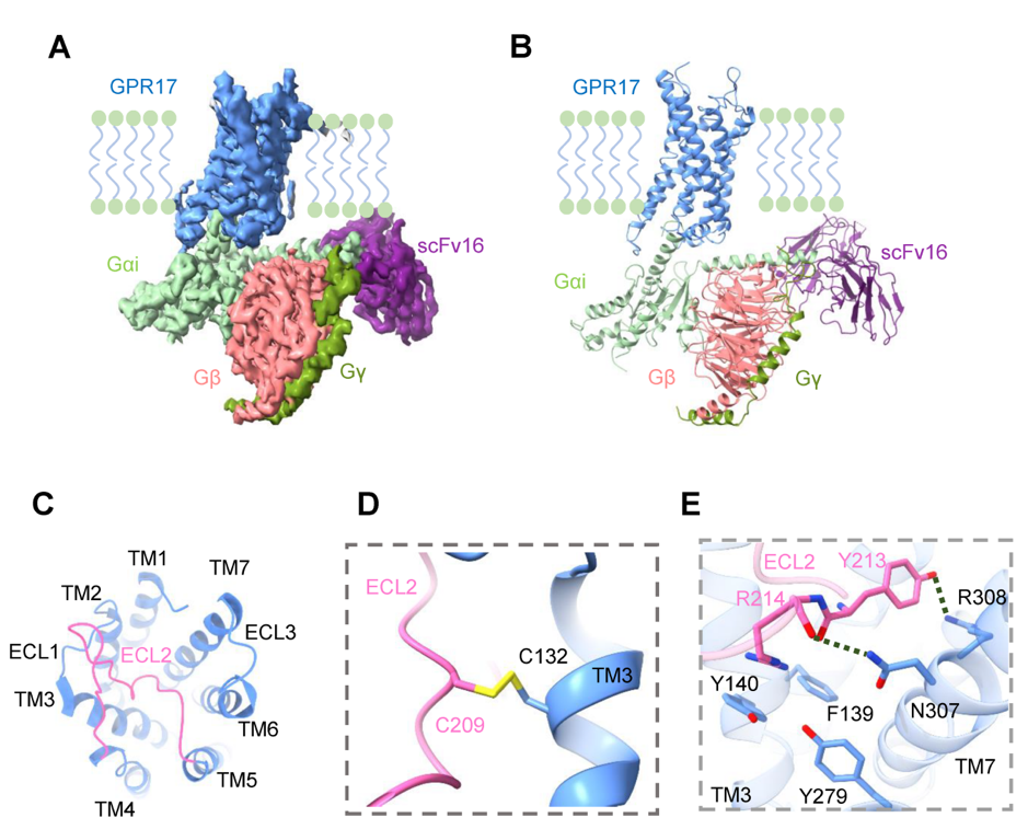 本研究首次解析了GPR17-Gi復(fù)合物的冷凍電鏡結(jié)構(gòu),揭示了GPR17的ECL2占據(jù)配體結(jié)合口袋,調(diào)控受體“自激活”的機(jī)制,為靶向GPR1的神經(jīng)系統(tǒng)退行性疾病藥物開發(fā)提供了重要的結(jié)構(gòu)基礎(chǔ)。