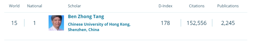 國際知名學術平臺Research.com發布了2023年度各個學科領域內的頂尖科學家榜單,香港中文大學(深圳)理工學院共有12位教授在各自領域內獲選為頂尖科學家。其中,唐本忠教授在化學領域被評為中國第一(世界第十五),在材料科學領域被評為中國第四(世界第二十八);張瑞教授在電子與電氣工程領域被評為新加坡第一(世界第四)。