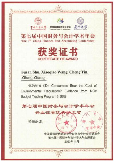 日前,港中大(深圳)經(jīng)管學(xué)院汪曉樵教授的合作論文“Do Consumers Bear the Cost of Environmental Regulation? Evidence from NOx Budget Trading Program”(《消費(fèi)者承擔(dān)環(huán)境監(jiān)管成本嗎?來自氮氧化物配額交易項(xiàng)目的證據(jù)》)獲頒“第七屆中國財(cái)務(wù)與會計(jì)學(xué)術(shù)年會興業(yè)證券優(yōu)秀論文獎”。
