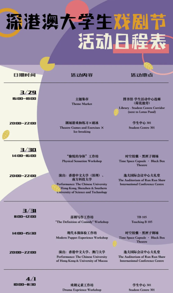 2024深港澳大學生戲劇節,將由香港中文大學(深圳)主辦,香港中文大學(深圳)大學藝術中心承辦,于2024年3月29日至4月1日舉行。本屆戲劇節主題為“圓”,屆時將有香港中文大學、澳門大學、香港中文大學(深圳)、南方科技大學四所大學帶來精彩的原創劇目演出。