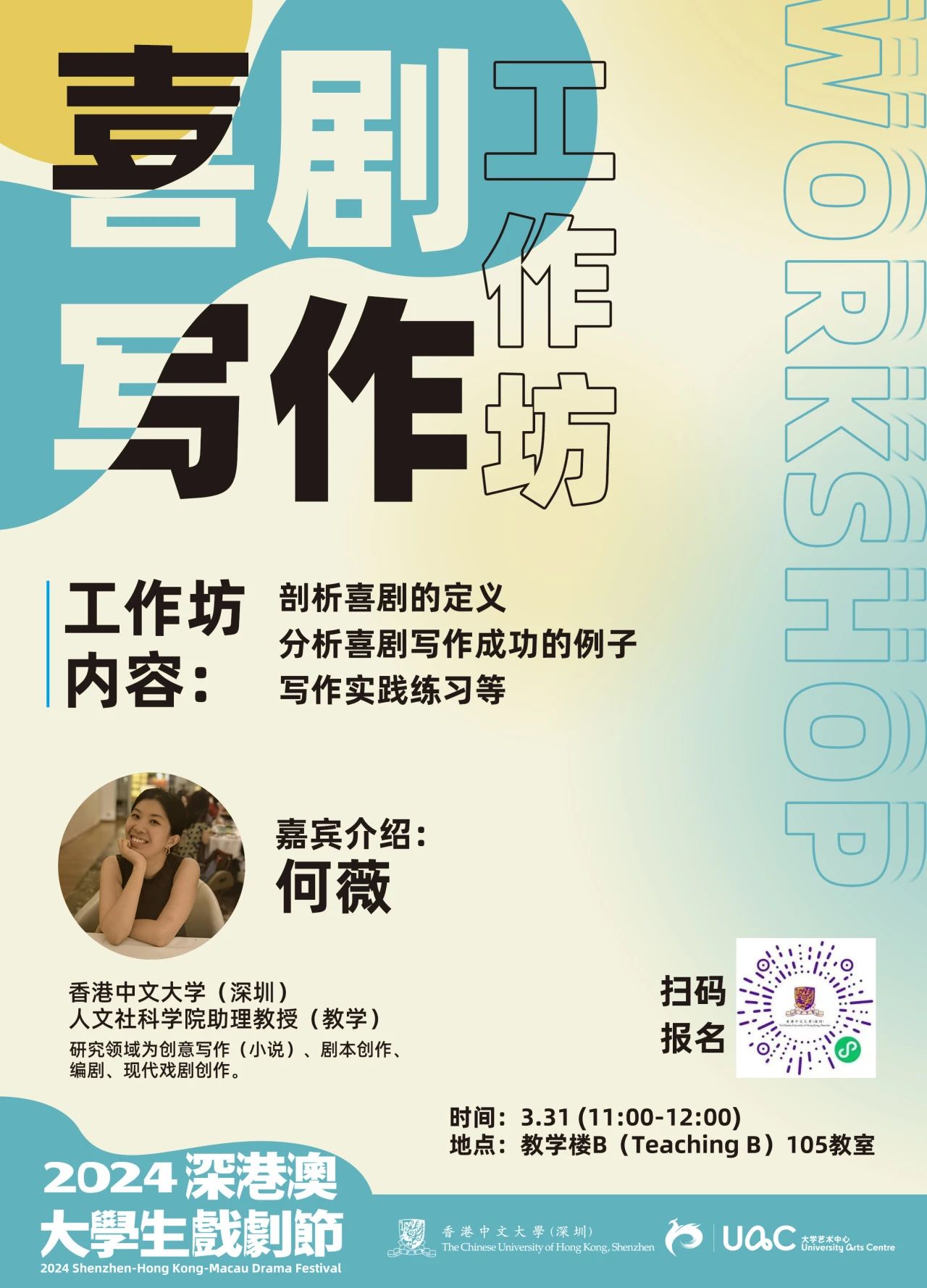 什么是真正的喜劇?戲劇作家們說喜劇的成功取決于時機和克制時,他們具體指的是什么?本次工作坊將與大家一起剖析喜劇的定義,并以家喻戶曉的喜劇作品為例,幫助同學們理解在進行喜劇創作時“克制”的重要性。