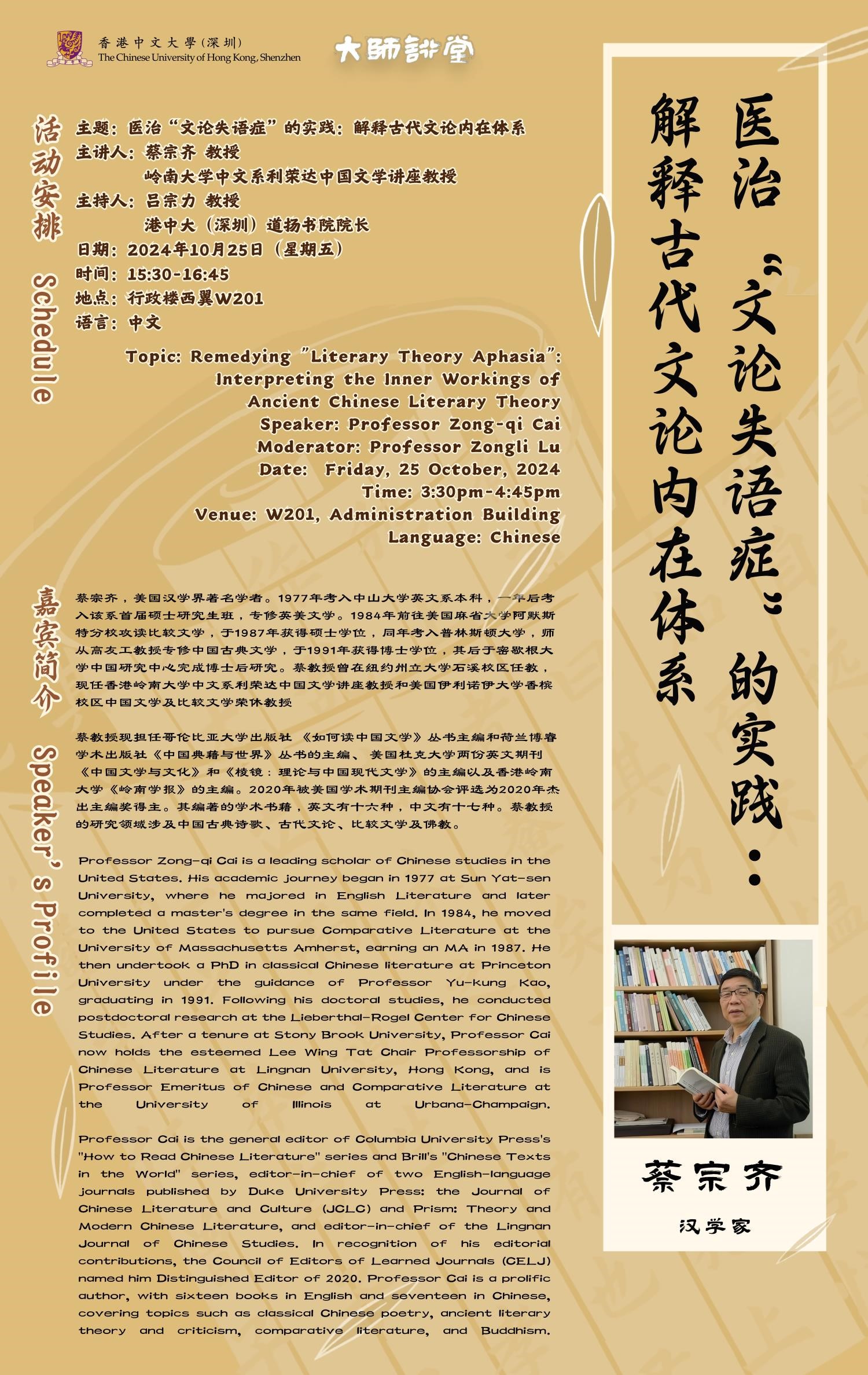 主講嘉賓:蔡宗齊教授 嶺南大學中文系利榮達中國文學講座教授