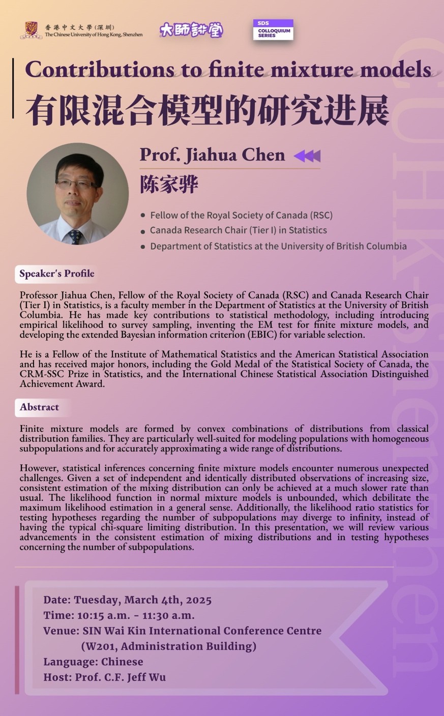 陳家驊教授,加拿?皇家學會(RSC)院?,加拿??級講座教授(統計學),現任英屬哥倫?亞?學統計學系教授。他在統計?法學??做出了重要貢獻,包括將經驗似然引?抽樣調查,發明有限混合模型的EM檢驗,以及提出適?于?模型空間的擴展貝葉斯信息準則(EBIC)。