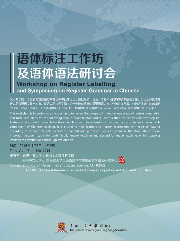 香港中文大學(深圳)人文社科學院擬于2016年4月7日至4月9日與香港中文大學-北京語言大學漢語語言學與應用語言學聯合研究中心聯合舉辦“語體標注工作坊及語體語法研討會”。