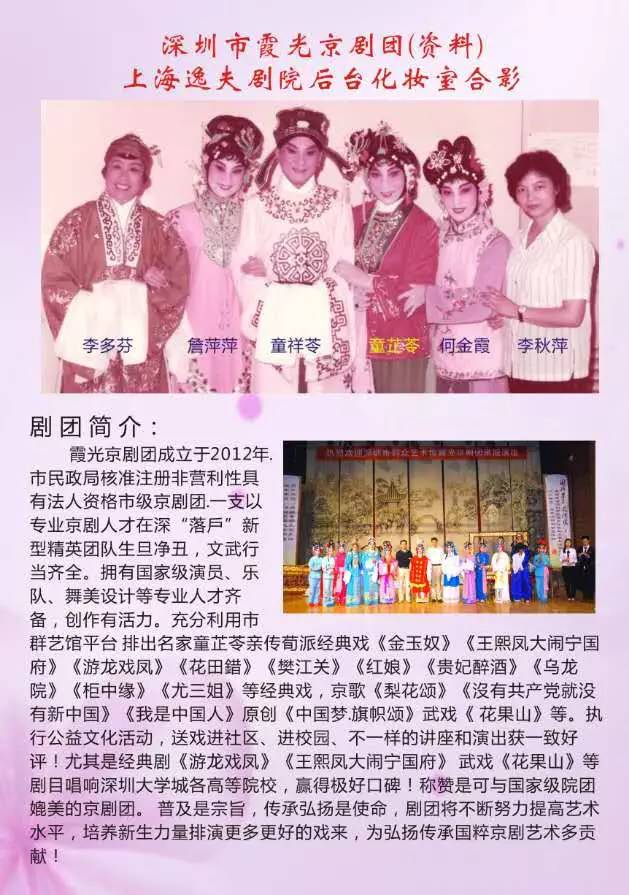 深圳市霞光京劇團成立于2012年,擁有國家級演員、樂隊和舞美設計等專業人才,致力于公益文化活動。其經典劇作《游龍戲鳳》、《王熙鳳大鬧寧國府》和《花果山》等深受好評。