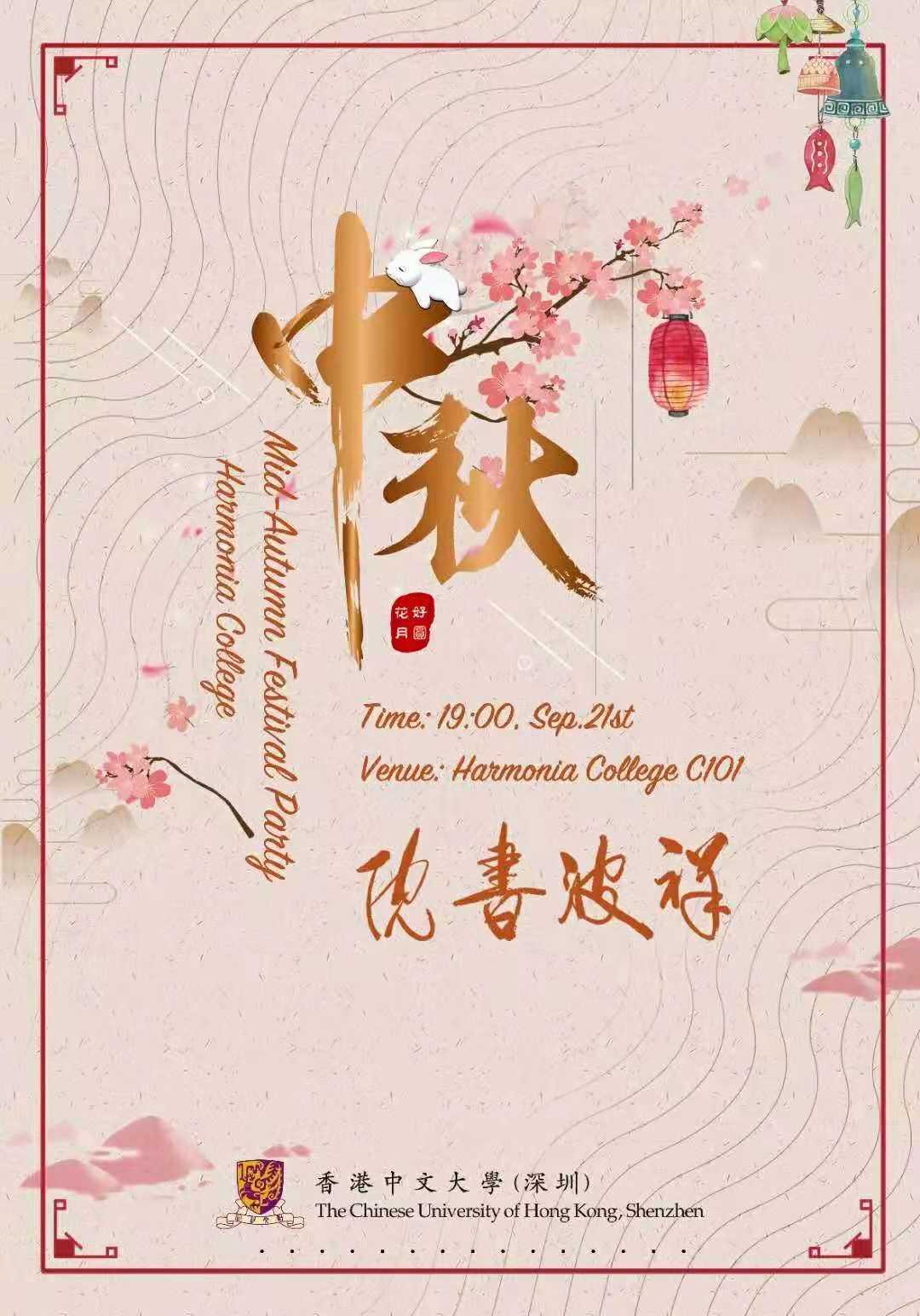 ? ? ? ?中秋節將至,這是祥波學子在港中大(深圳)迎來的第一個傳統節日。為慶祝中秋,祥波書院為大家準備了一場精彩有趣的中秋派對。屆時不但有精彩的節目,趣味十足的游戲,更有巨型月餅、神秘禮品和美味茶歇等著你!