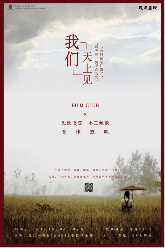 ? ? ? ?思廷書院誠摯邀你參加思廷書院·不二傾談之電影欣賞會 ——《我們天上見》放映活動。國慶假期之際,我們將帶領同學們走進那灰瓦白墻的質樸年代,一同體驗百味人生。電影結束后會有座談的部分,主題將圍繞個人人生和國家命脈交織,會有主持人帶領討論。本次活動歡迎各個書院同學參與。