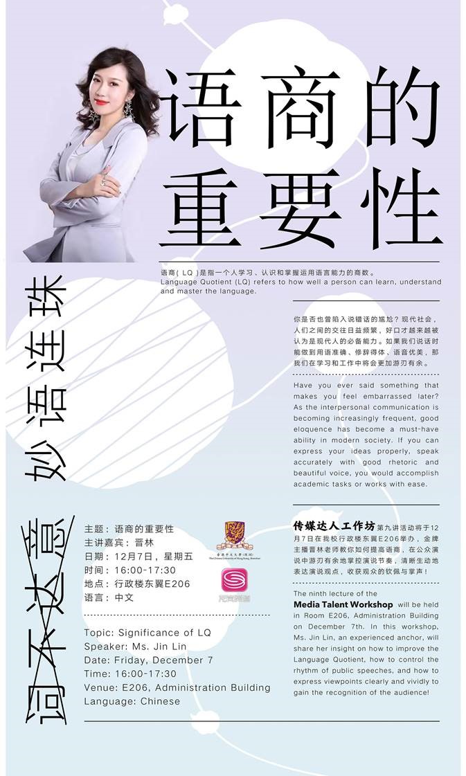 ? ? ? ? “傳媒達人工作坊”第九講活動將于12月7日在我校行政樓東翼E206舉辦,金牌主播晉林老師教你如何提高語商,在公眾演說中游刃有余地掌控演說節(jié)奏,清晰生動地表達演說觀點,收獲觀眾的欽佩與掌聲!