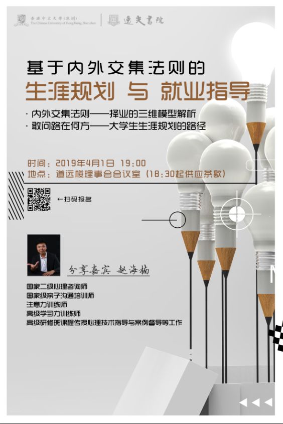 活動預告 | 職業生涯規劃大咖來襲!你離心儀offer,只差一份清晰的職業規劃! 2019-05-22 活動預告 2019年4月1日19:00,職業生涯規劃大咖趙海楠老師將在道遠樓理事會會議室為大家帶來關于生涯規劃與就業指導講座。 ? 趙海楠,全球職業規劃師(GCDF)、全球生涯教練(BCC)、專業生涯咨詢師(PCDC)講師、國家二級心理咨詢師、國家級親子溝通培訓師、注意力訓練師,高級學習力訓練師。 ?