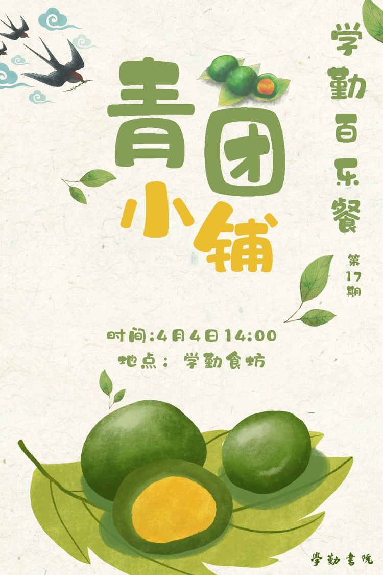 活動預告 | 學勤百樂餐:青團小鋪 2019-04-02 活動預告 本期學勤百樂餐,邀你和哈工大(深圳)的同學一起制作青團,傳承清明文化。兼有清香撲鼻精致可愛的外在形象和厚重悠久的文化內涵,這樣的青團即將在你的巧手中呈現~ 時間:4月4日(星期四)14:00 地點:學勤食坊