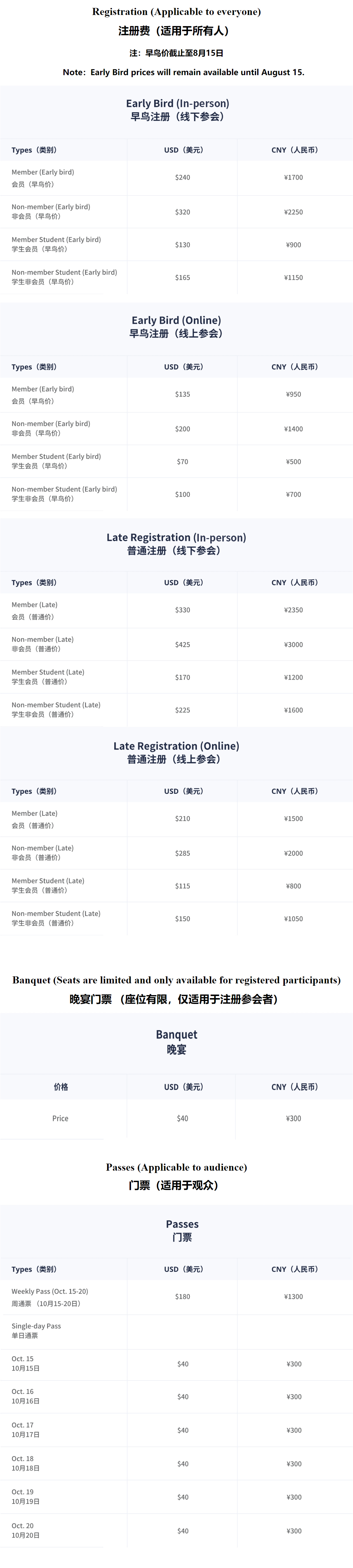 關于參會注冊費及門票價格詳情,請參閱下方圖表。